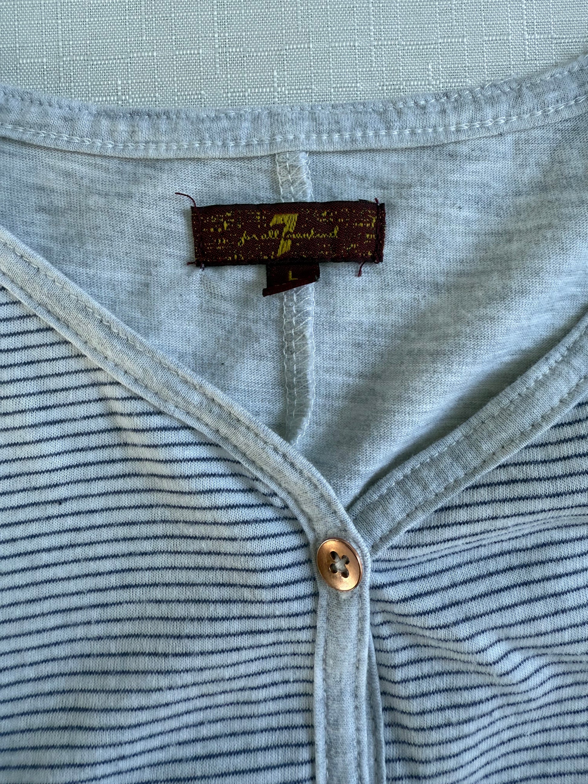 Easy, breezy, and unexpectedly cool—this sleeveless tank from 7 For All Mankind is the kind of piece you reach for on a sunny morning without even thinking. With a flattering V-neckline, wood-style buttons, and a playful mix of fine and bold navy stripes, it’s a little nautical, a little laid-back, and very weekend-ready.