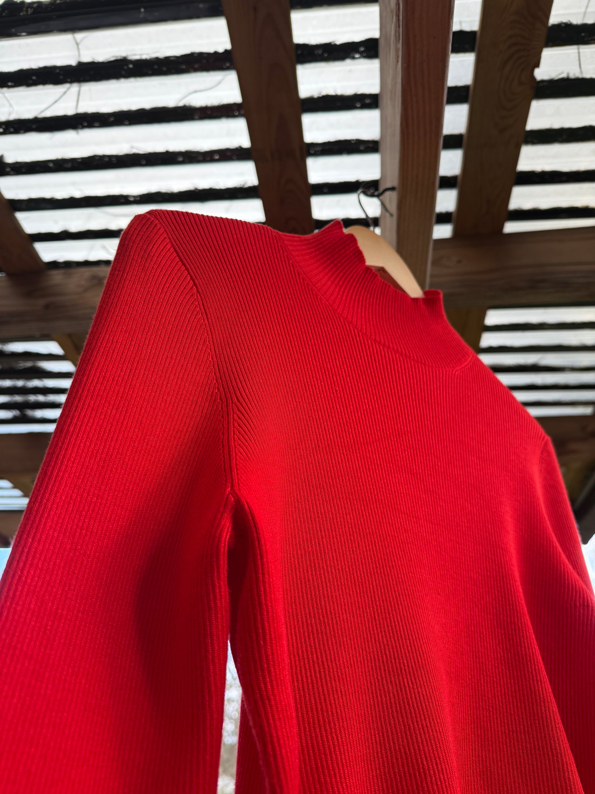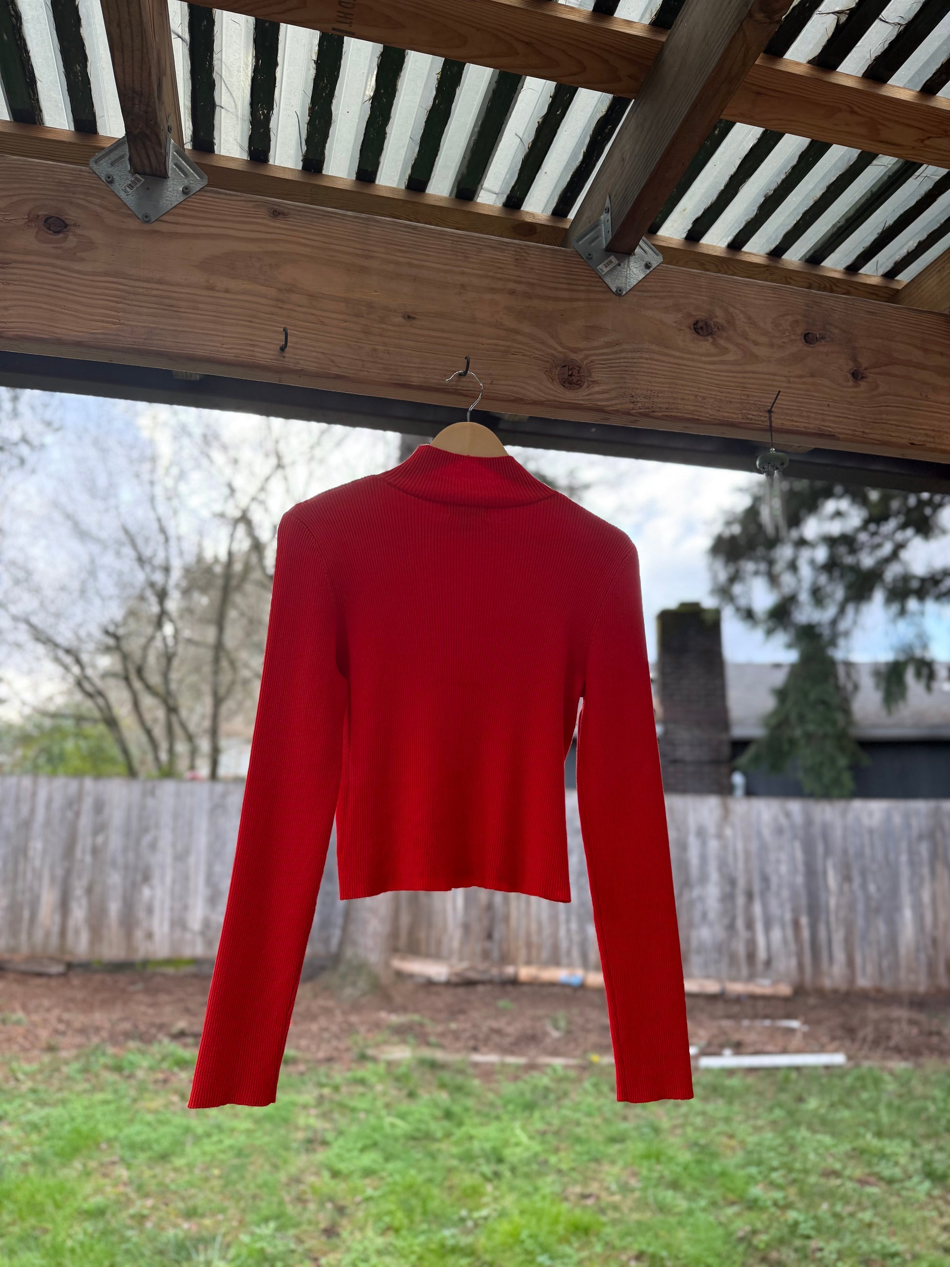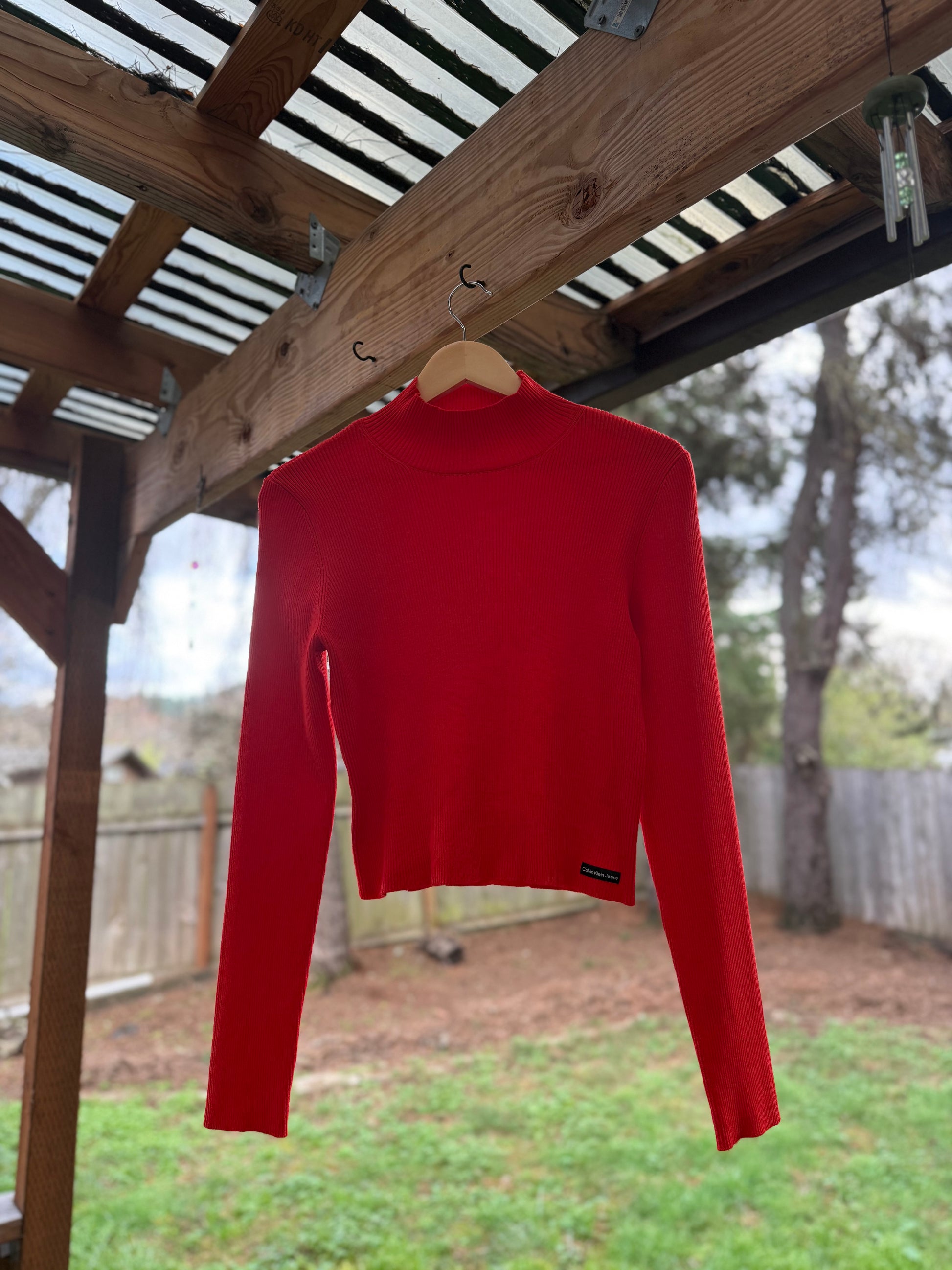 A true power red moment. This Calvin Klein Jeans ribbed mock neck crop is fitted, sculpting, and quietly bold. This is the kind of piece that doesn’t need to shout to be noticed. The ribbed knit hugs just right, the mock neck adds structure, and the cropped length keeps it playful and modern. Wear it solo as a statement or layer it under a jacket when you want the color to do the talking.