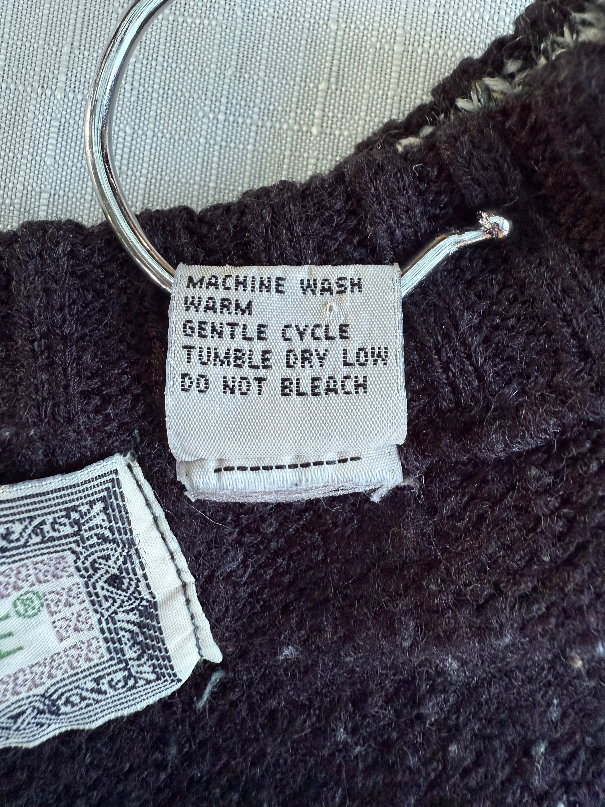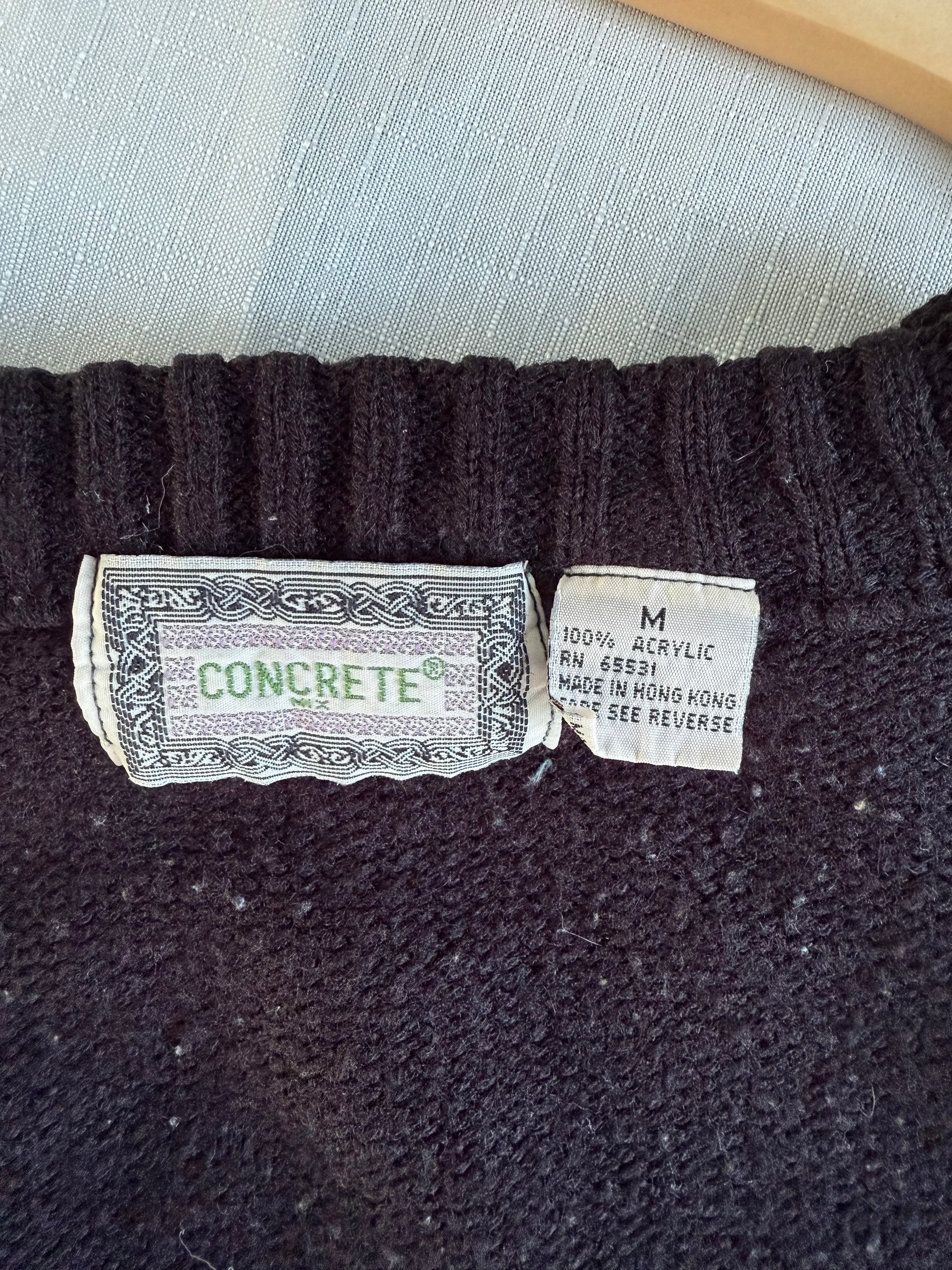 Graphic, grungy, and straight from the 1990s, this vintage Concrete sweater brings serious Coogi-adjacent energy with its textured acrylic knit and bold geometric pattern. Rich in color and detail, it’s an instant statement piece for fall layering or cool-weather city walks.