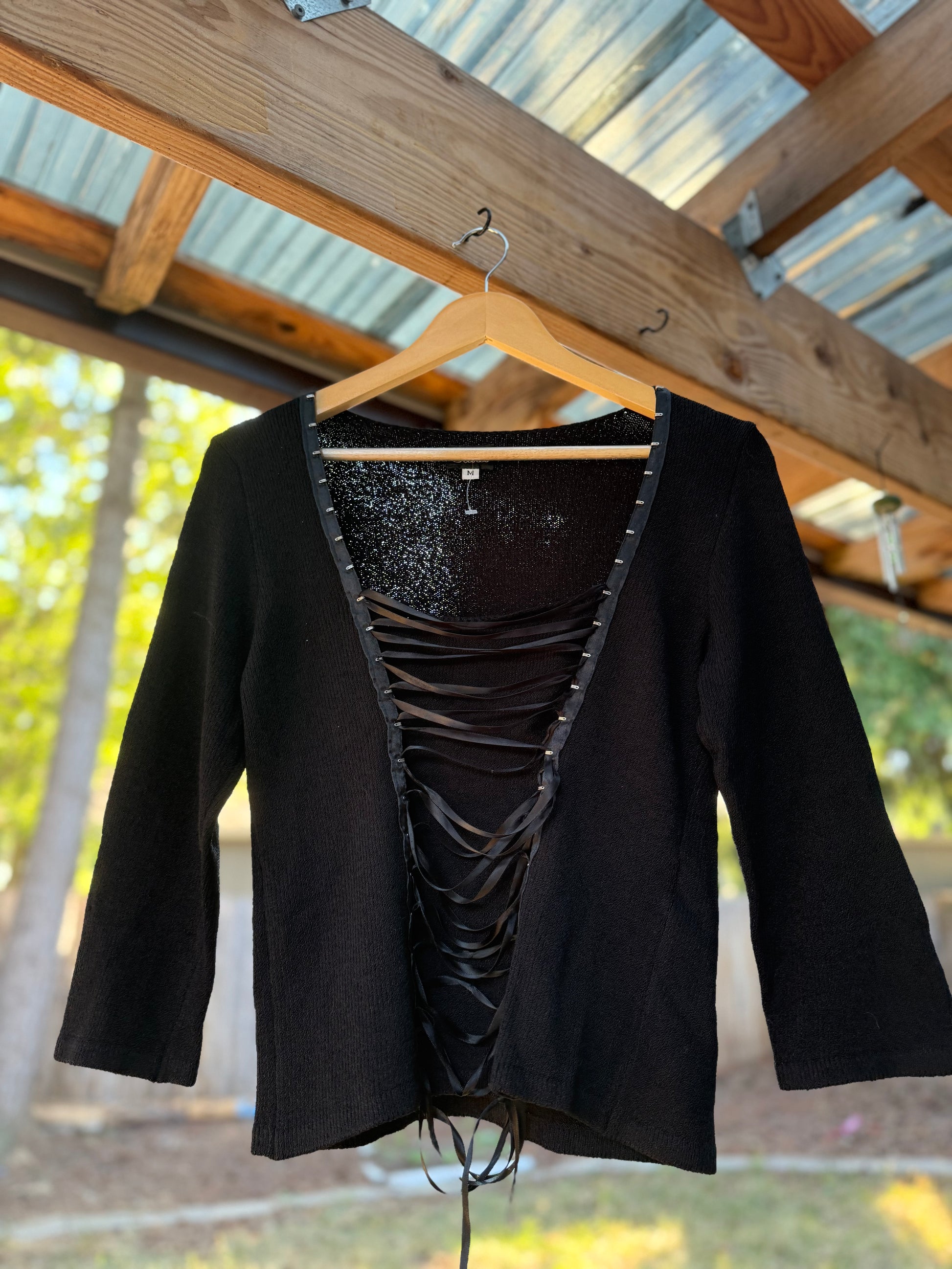 Not your average black knit. This statement piece features a plunging deep-V neckline, corset-style satin ribbon lacing, and metal grommet accents that give it a soft edge. Equal parts daring and wearable, the cropped silhouette and textured cotton-rayon blend make it a go-to for layering or bold solo styling.