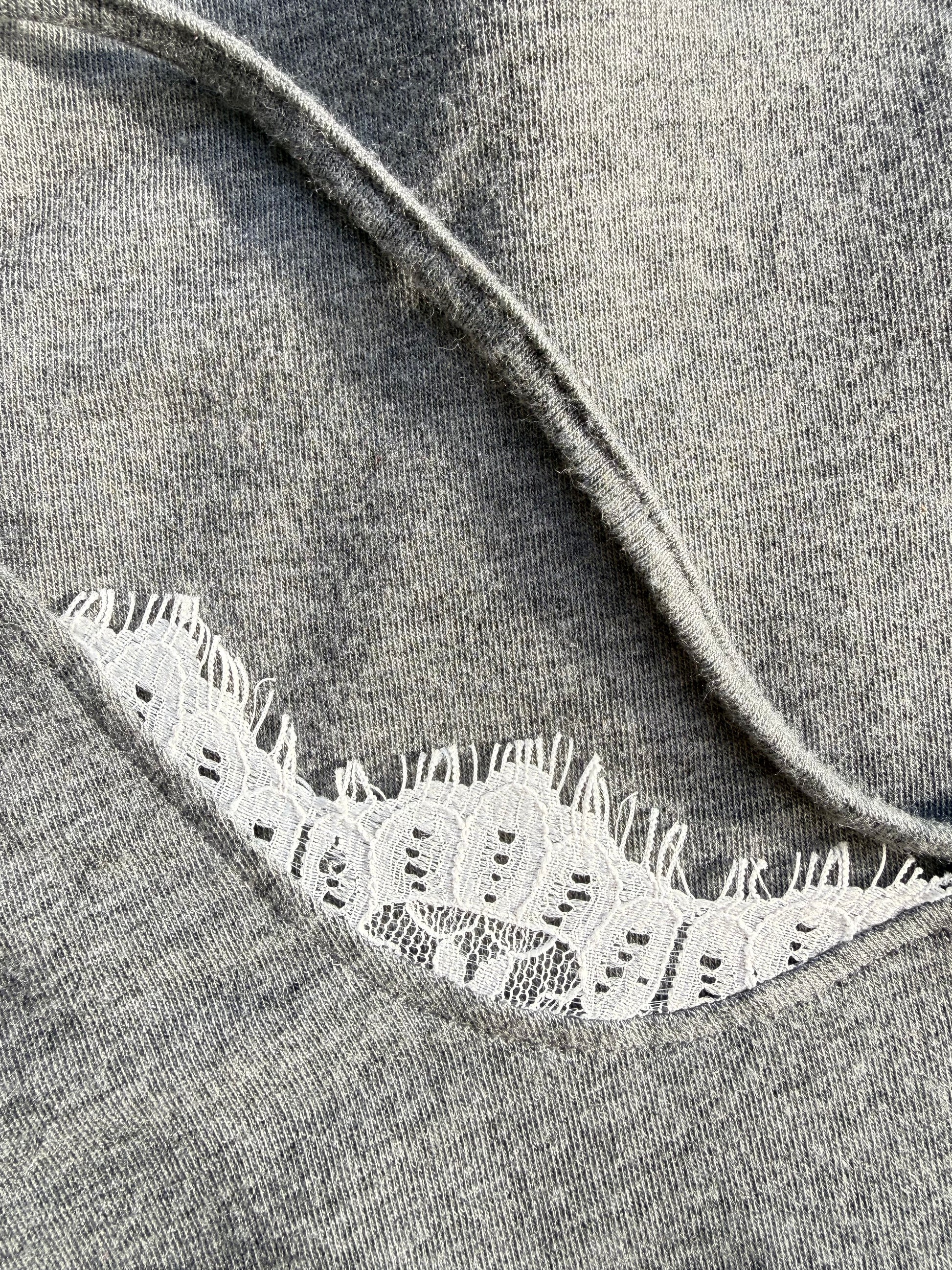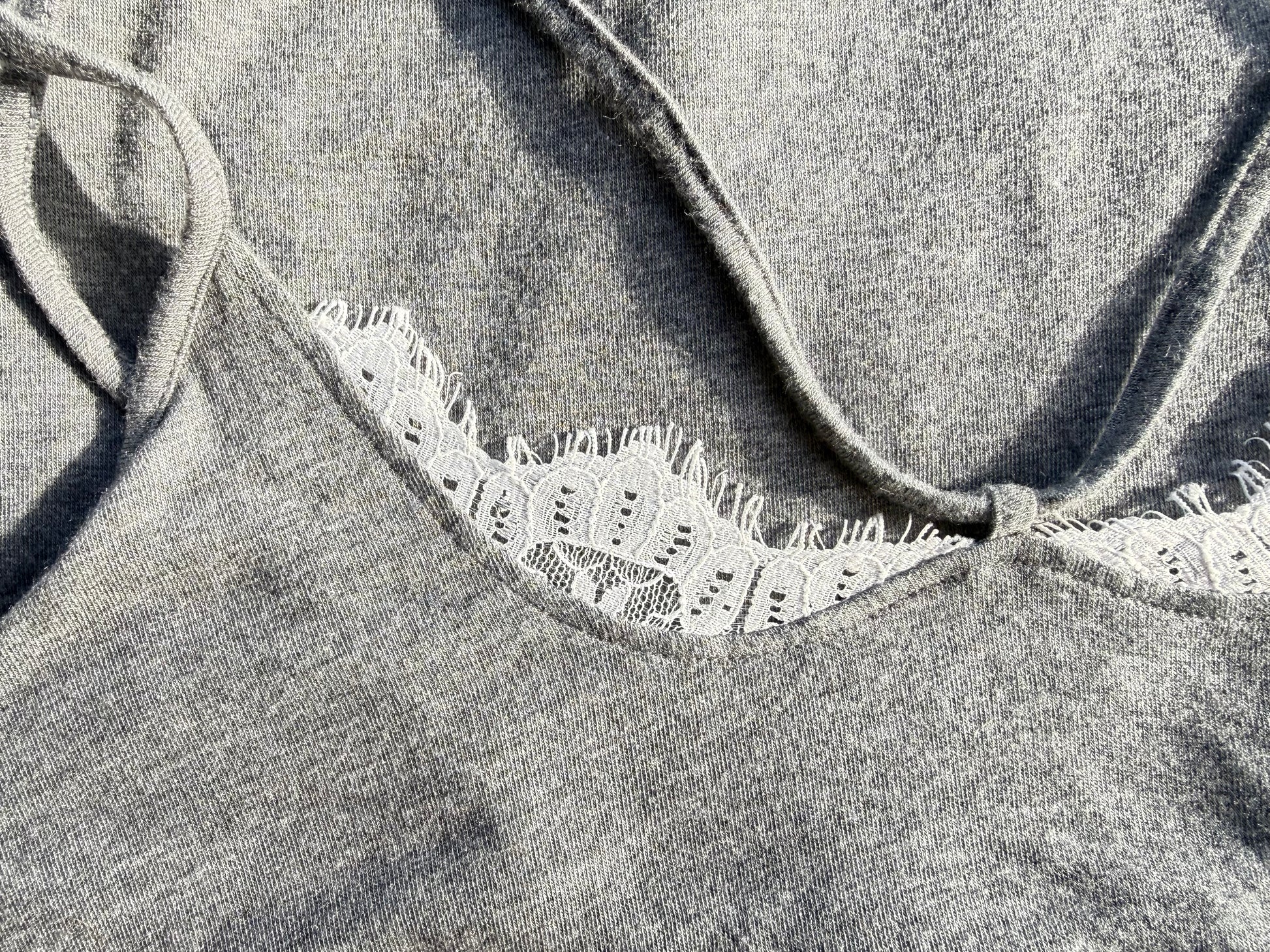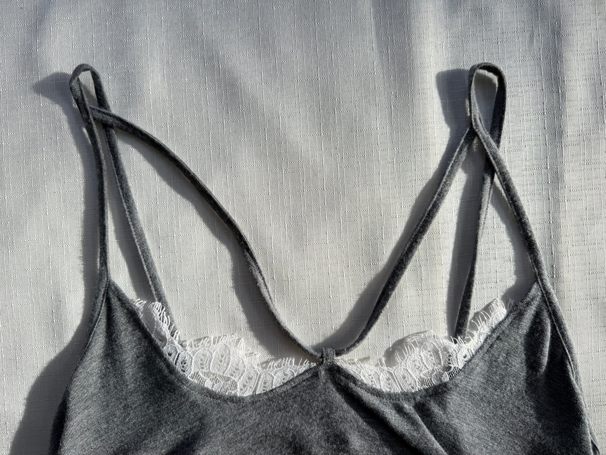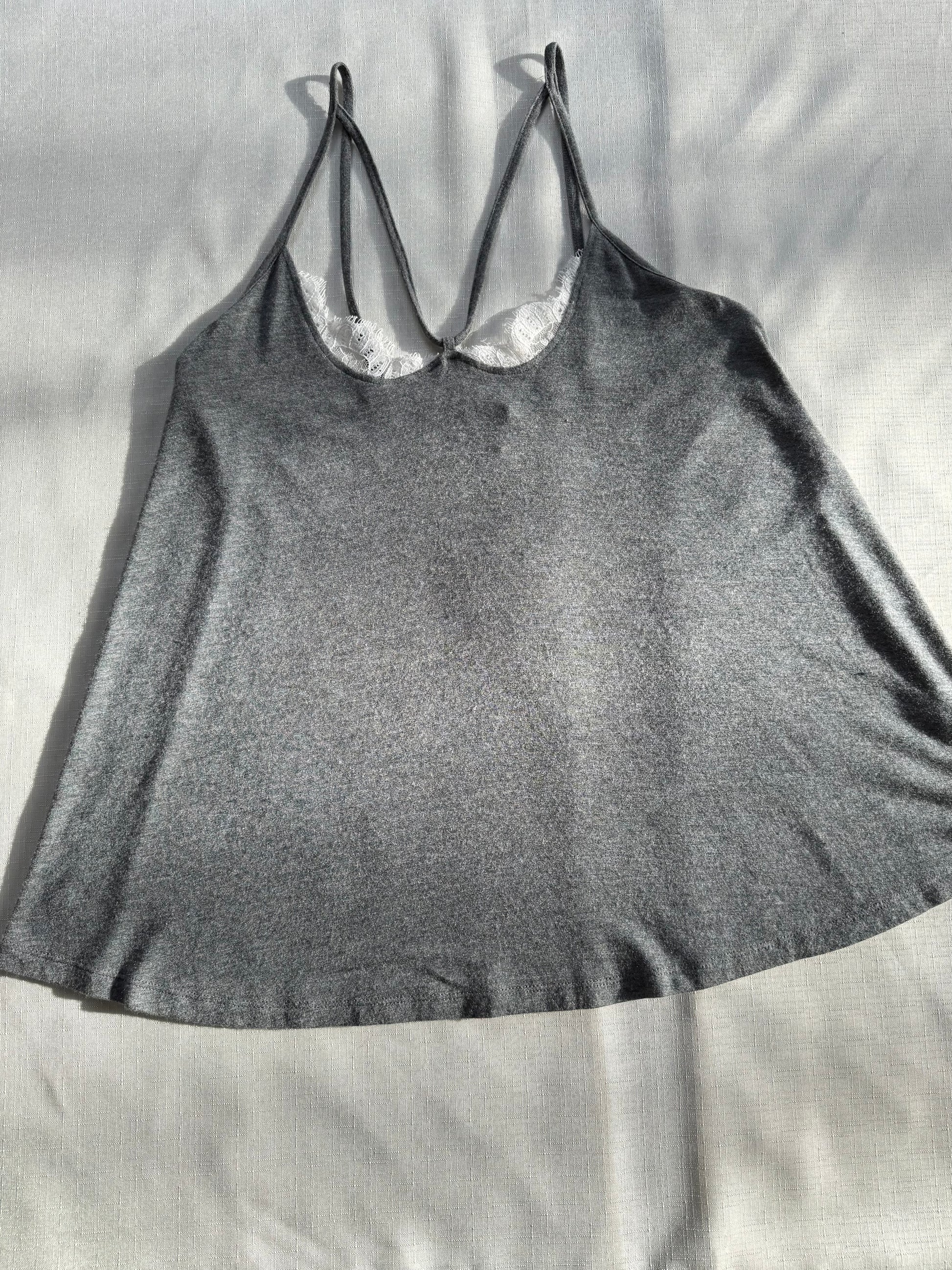That barely-there favorite you reach for without thinking. Soft grey jersey with delicate white lace peeking at the neckline and a slim, double-strap that feels quietly intentional. Lightweight, drapey, and gently flared through the body, this one layers beautifully but also holds its own on warm days. Easy, romantic, and just structured enough to feel styled.