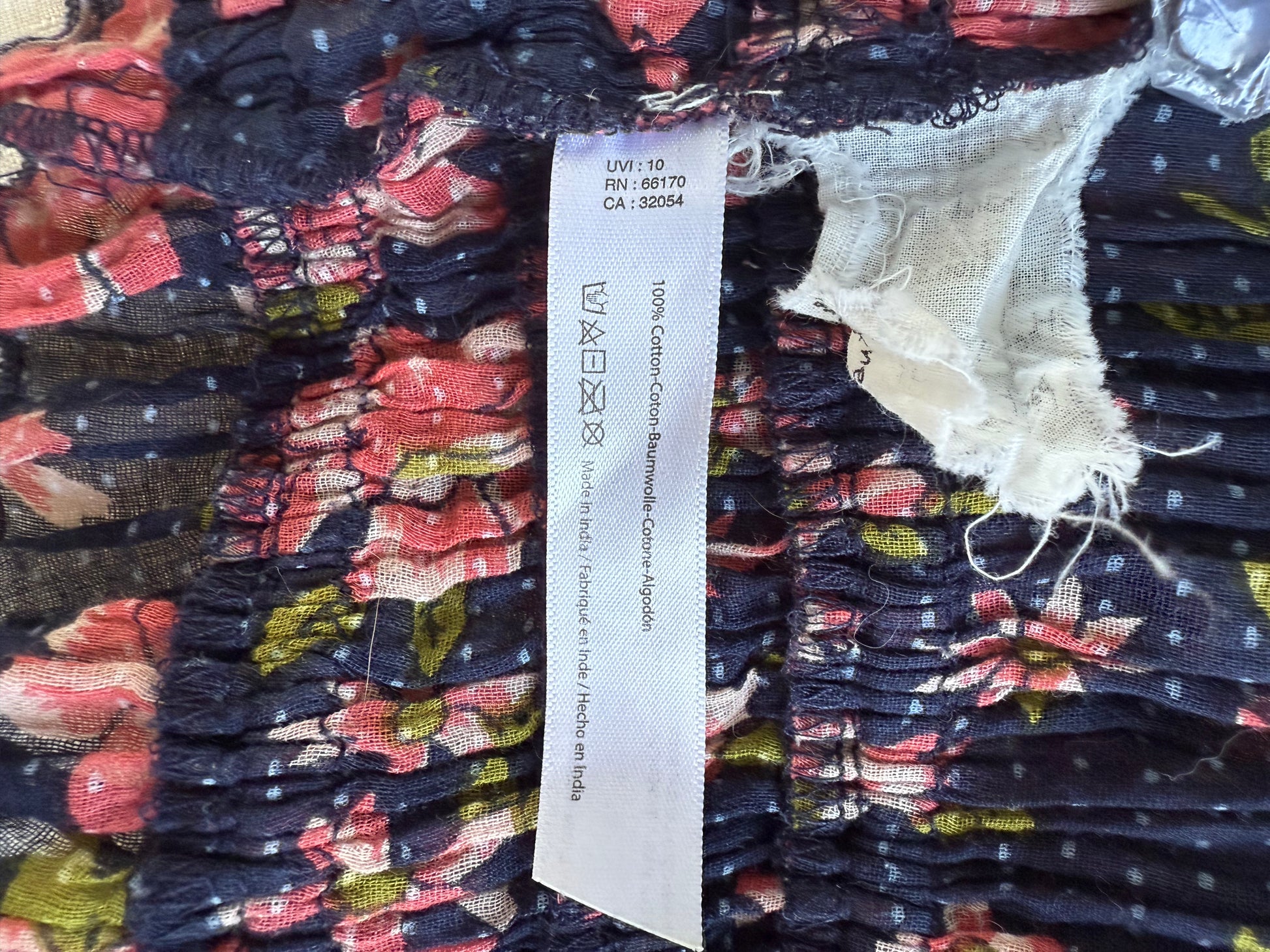 Fit note: Tagged size M, but thanks to the smocking it fits flexibly—best for US 4–8 depending on desired snugness. Fabric is sheer and lightweight. Excellent condition.