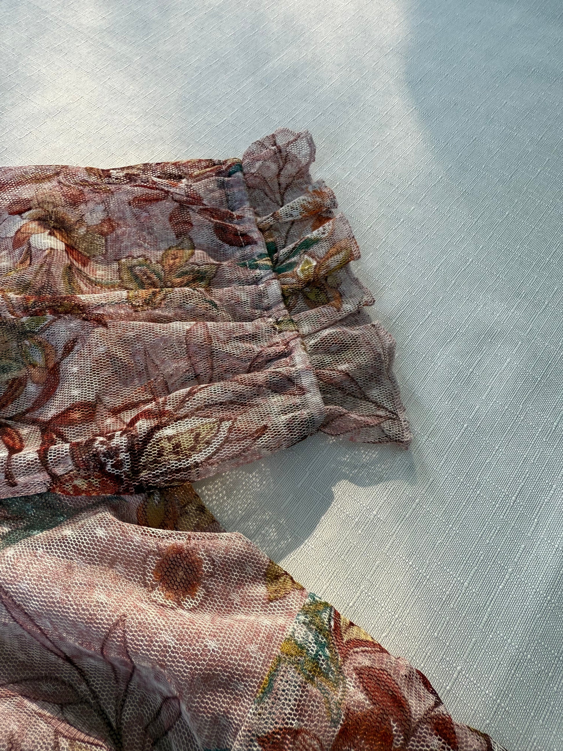 Sheer, soft, and a little spellbound — this romantic mesh top brings peak fairy-in-the-city energy. Layered floral print in sunset tones, with ruched detailing and ruffle hem, plus dreamy puff sleeves and adjustable shoulder ties. One of those tops that feels like a moment, even with jeans.