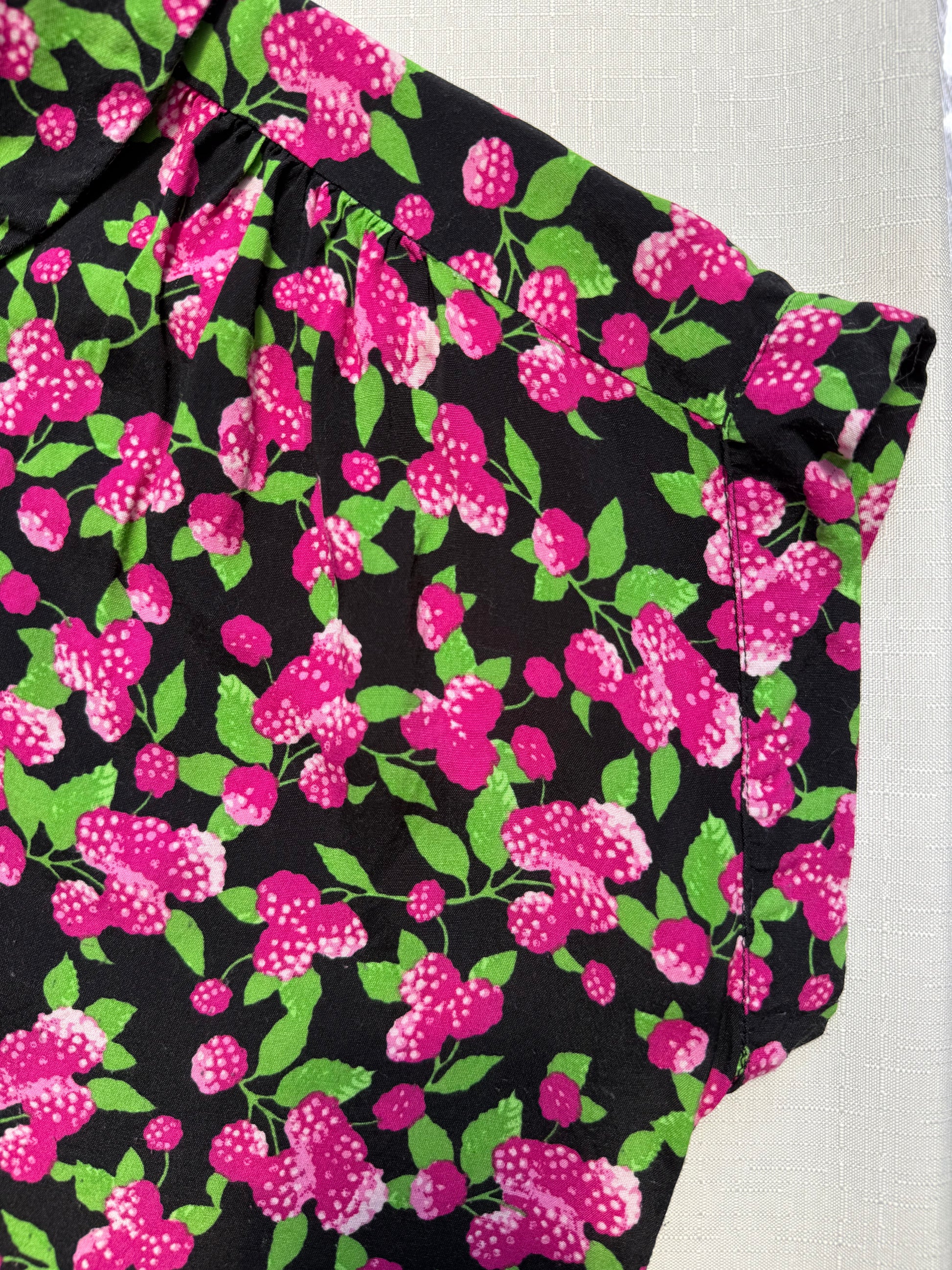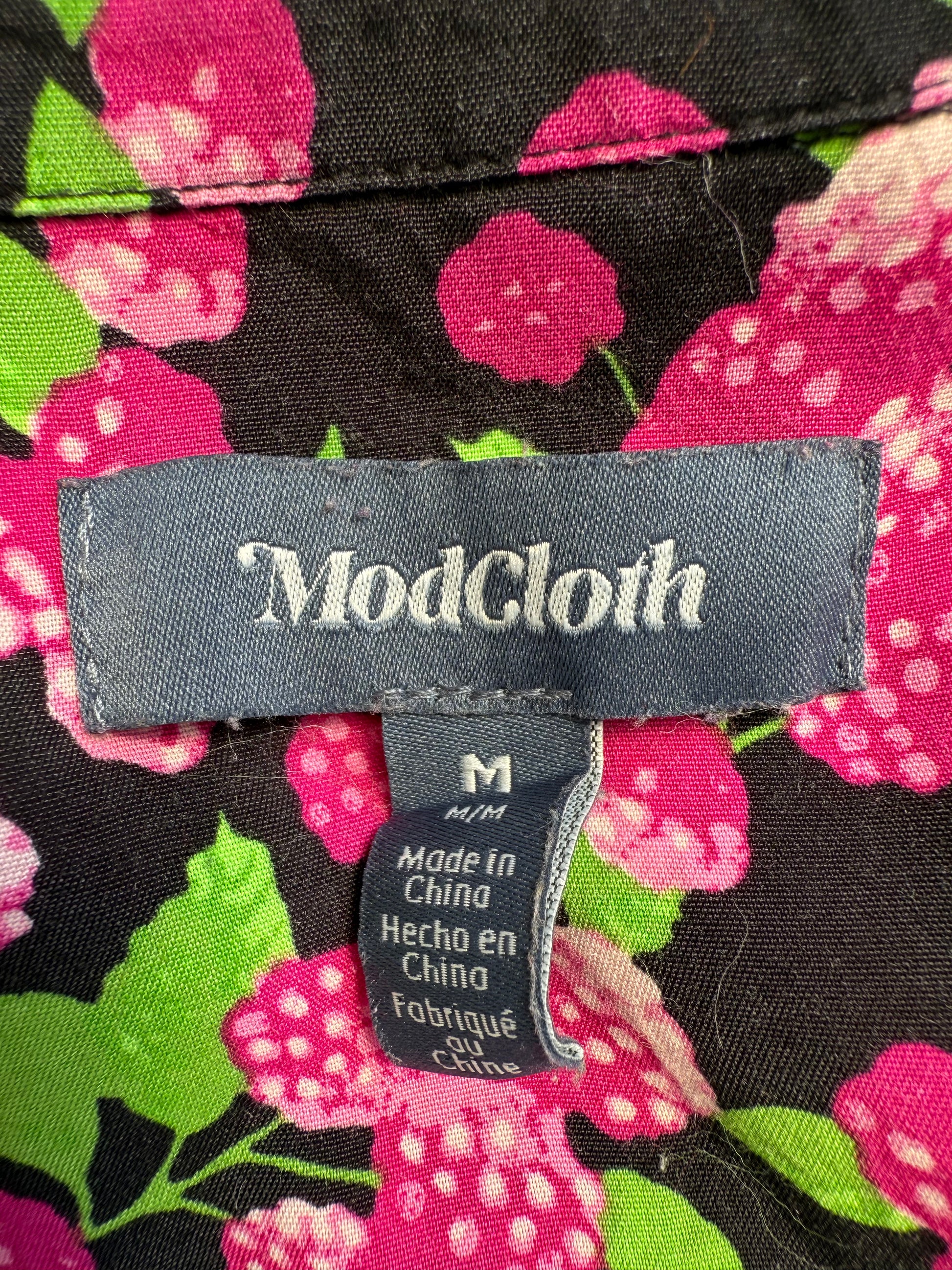 This vibrant ModCloth blouse is all about joyful energy—black base with saturated raspberry-pink florals and fresh green leaves. The silhouette is flowy and easy with a subtle high-low hem, gathered yoke detailing, and sweet short sleeves. A partial button front adds a vintage nod without going full retro.