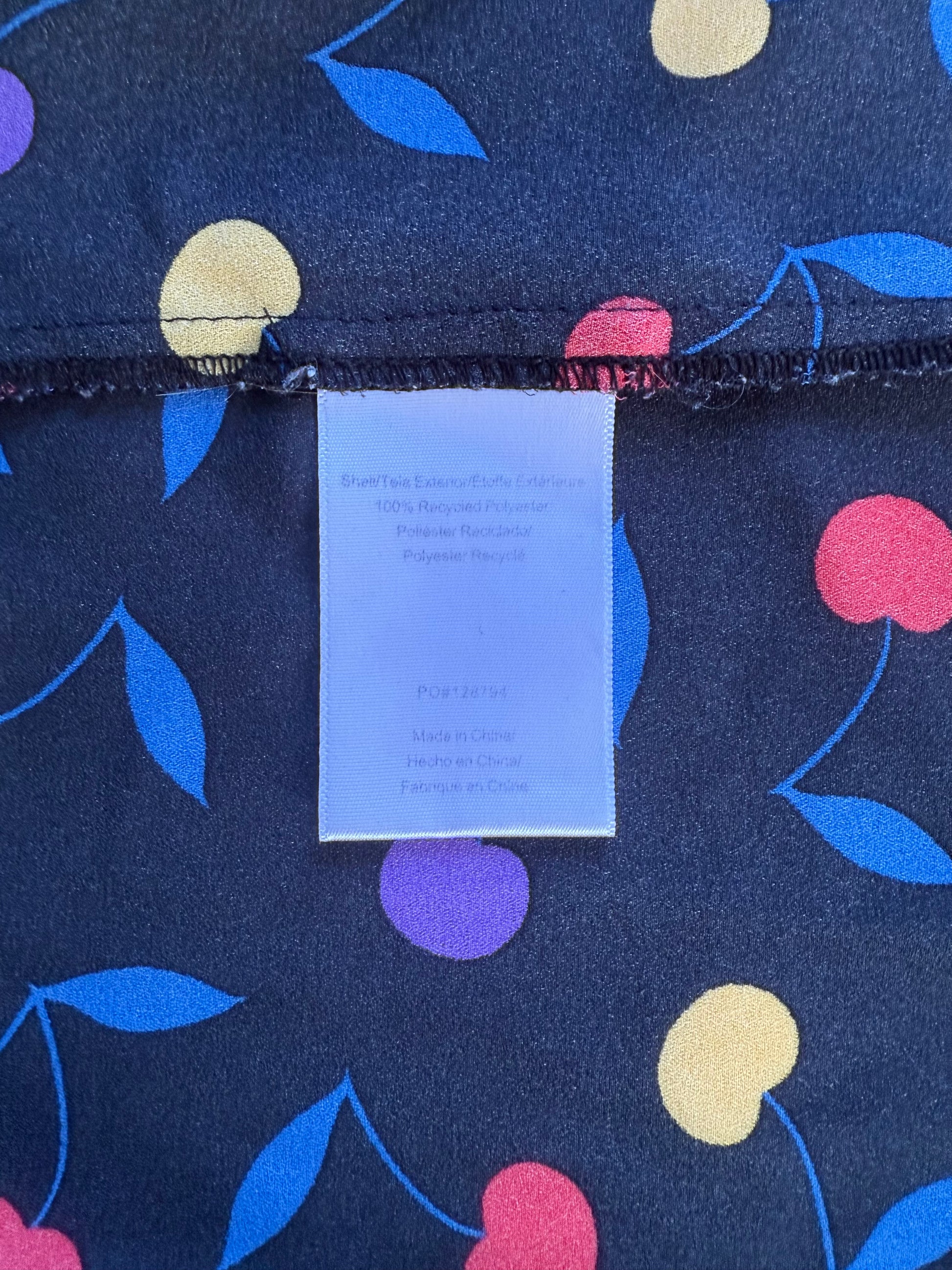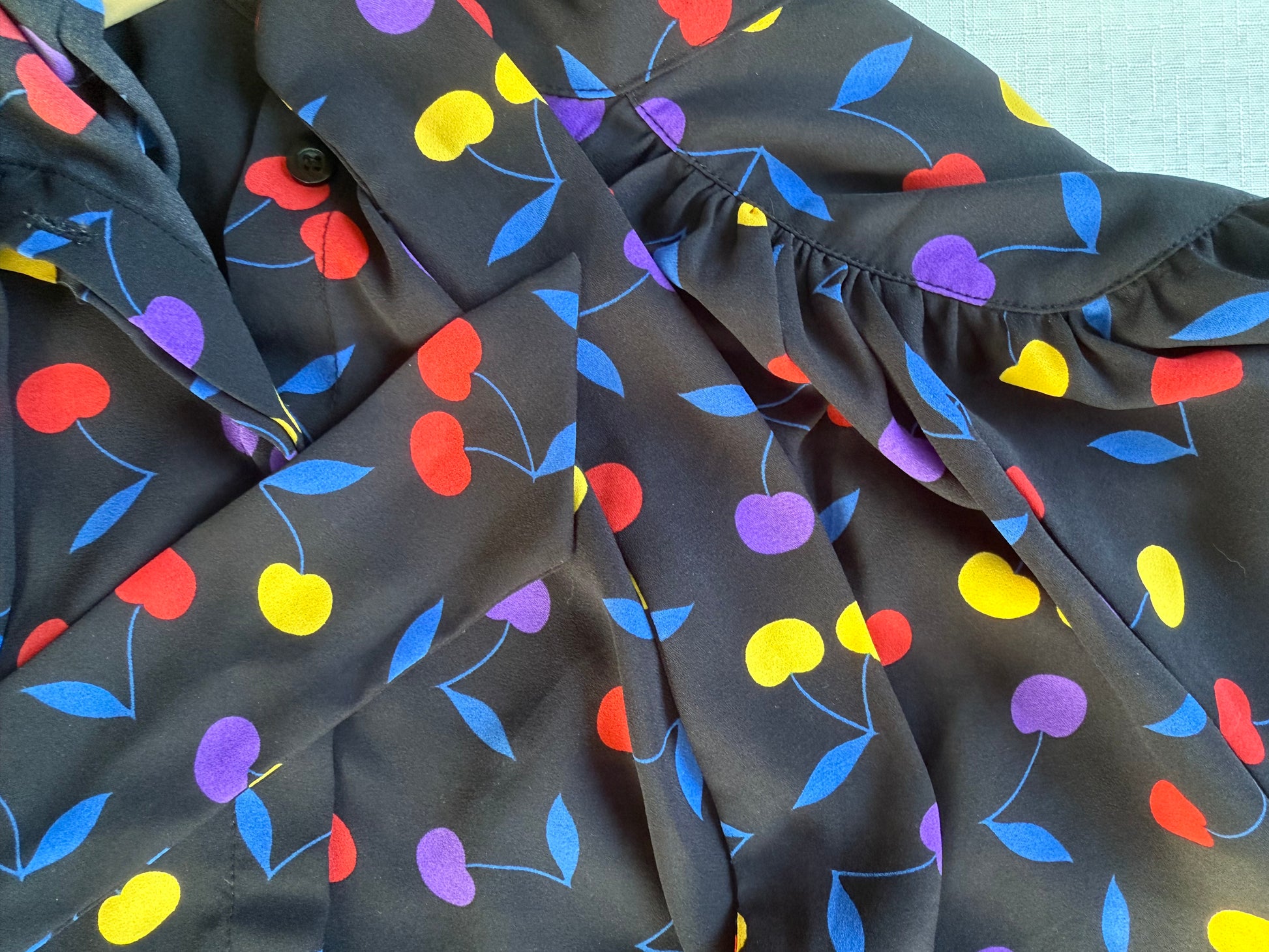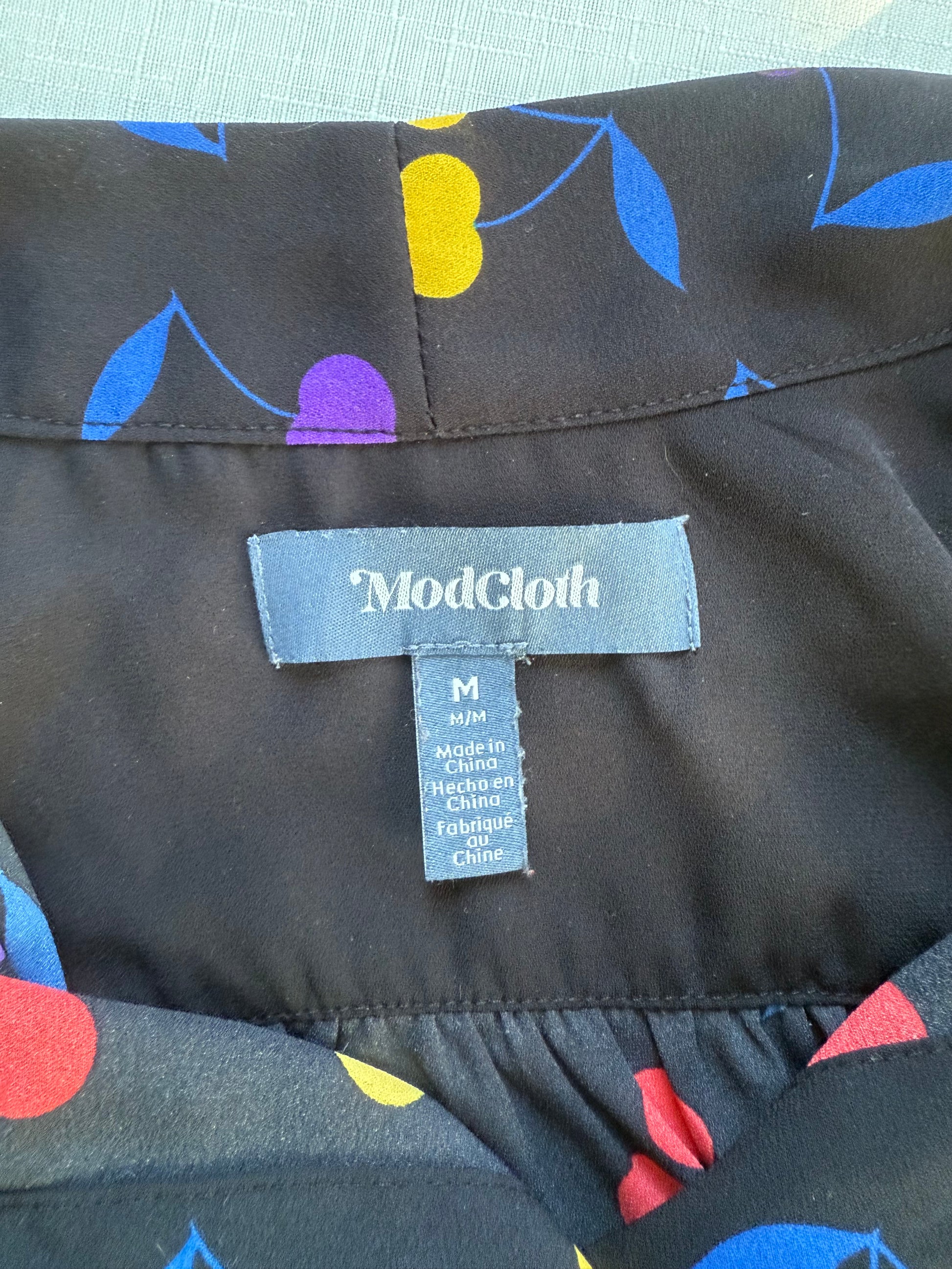 Cheeky, bold, and impossibly fun—this ModCloth blouse serves serious retro energy with a colorful cherry print that feels straight off a vintage jukebox. Featuring a relaxed fit, half sleeves, gathered shoulders, and a tie-neck detail for styling versatility. Lightweight and semi-sheer black polyester with bright red, yellow, purple, and blue cherries.