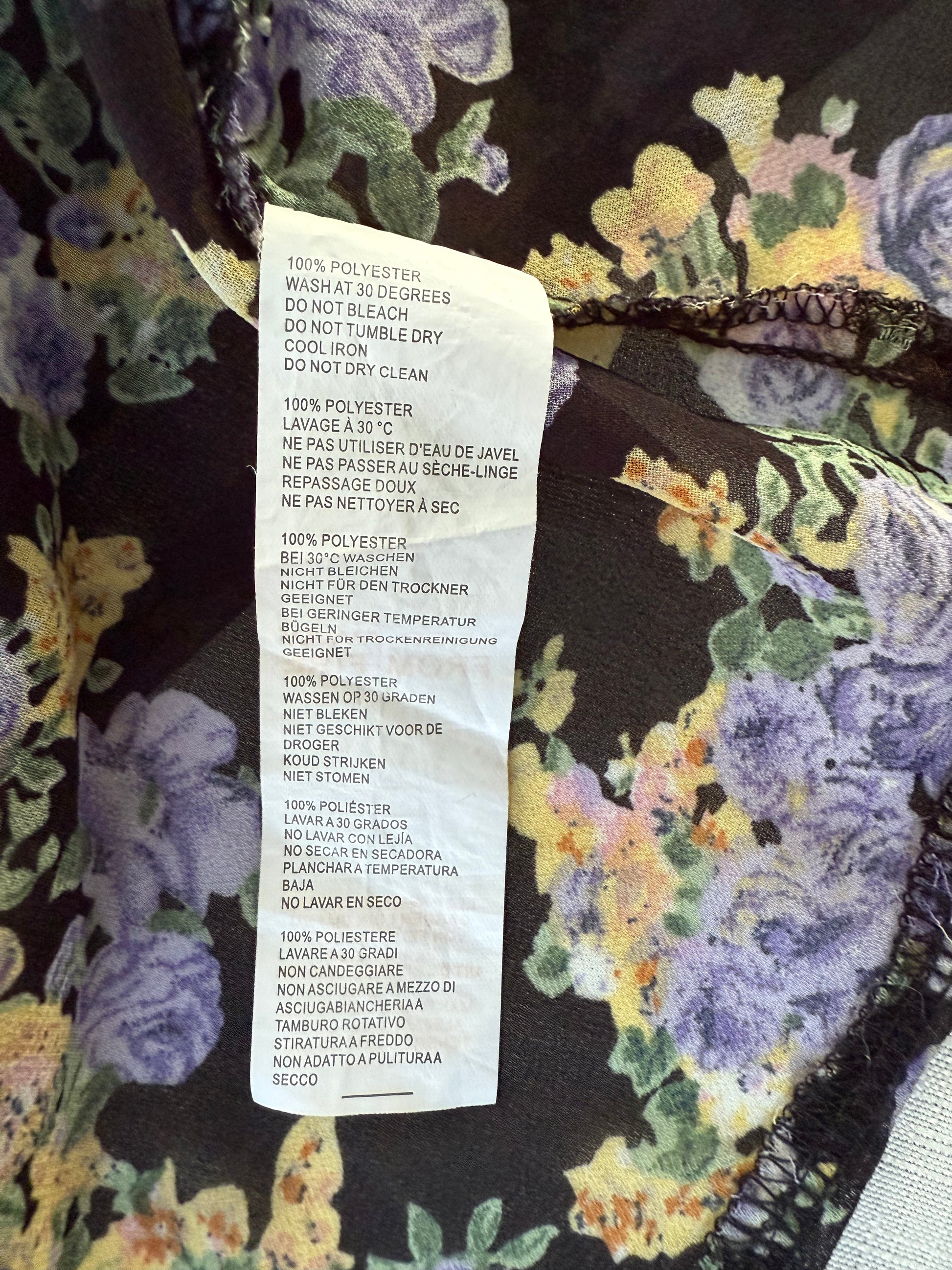 Wash cold (30°C), cool iron, do not tumble dry or dry clean.