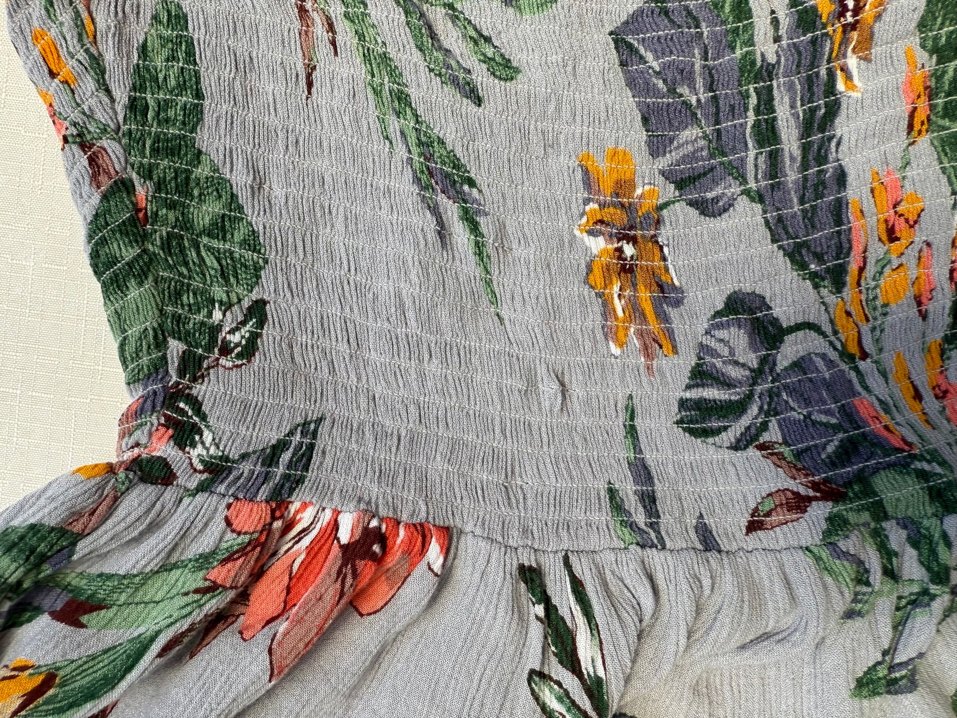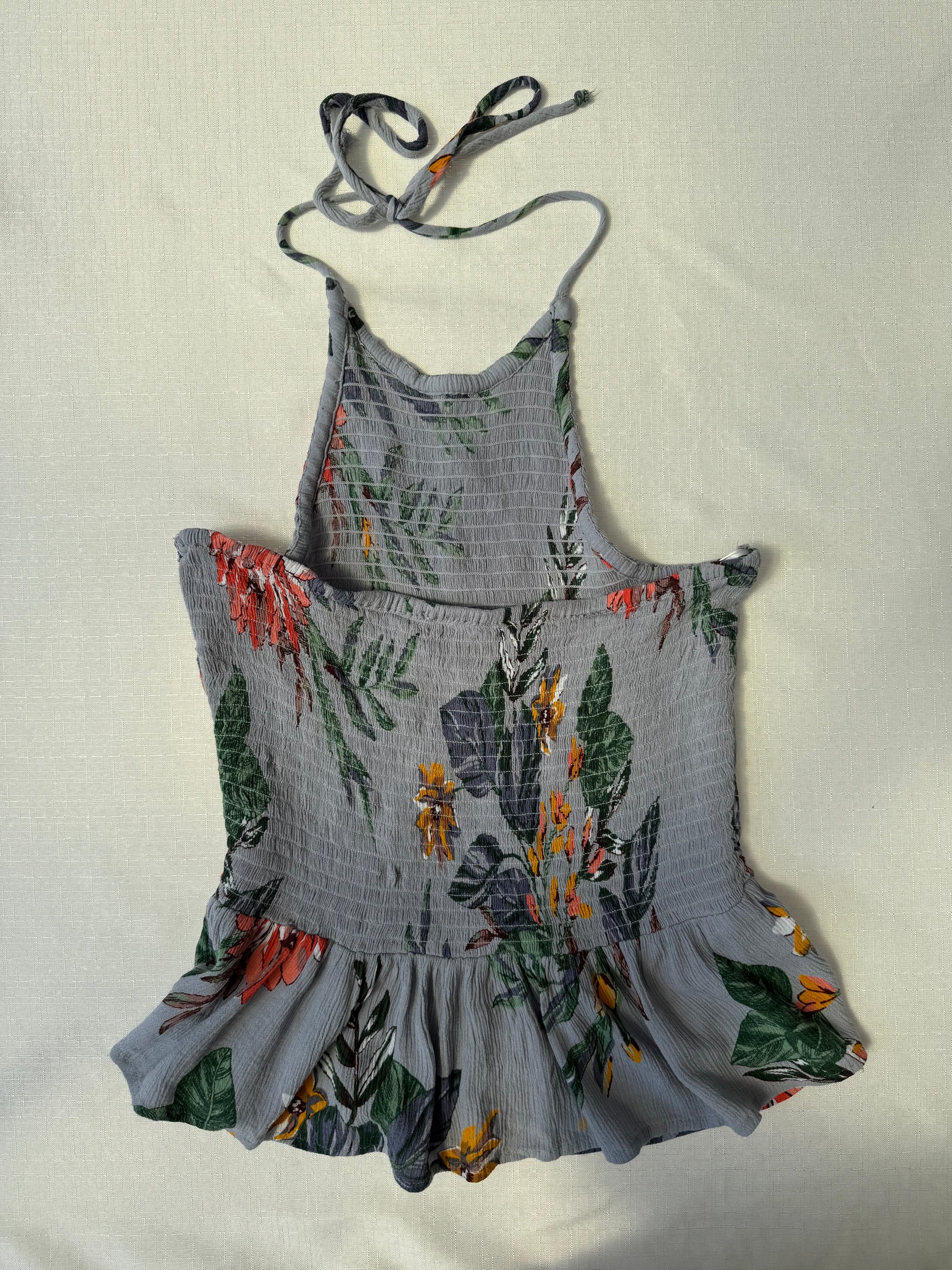 This top brings just the right amount of flirt to a warm day. With a smocked bodice, halter neckline, and ruffled peplum hem, it hugs in all the right places and floats where you want it to. The grey base and bold floral print make it feel romantic but not too precious — easy to dress up or throw on with cutoffs.
