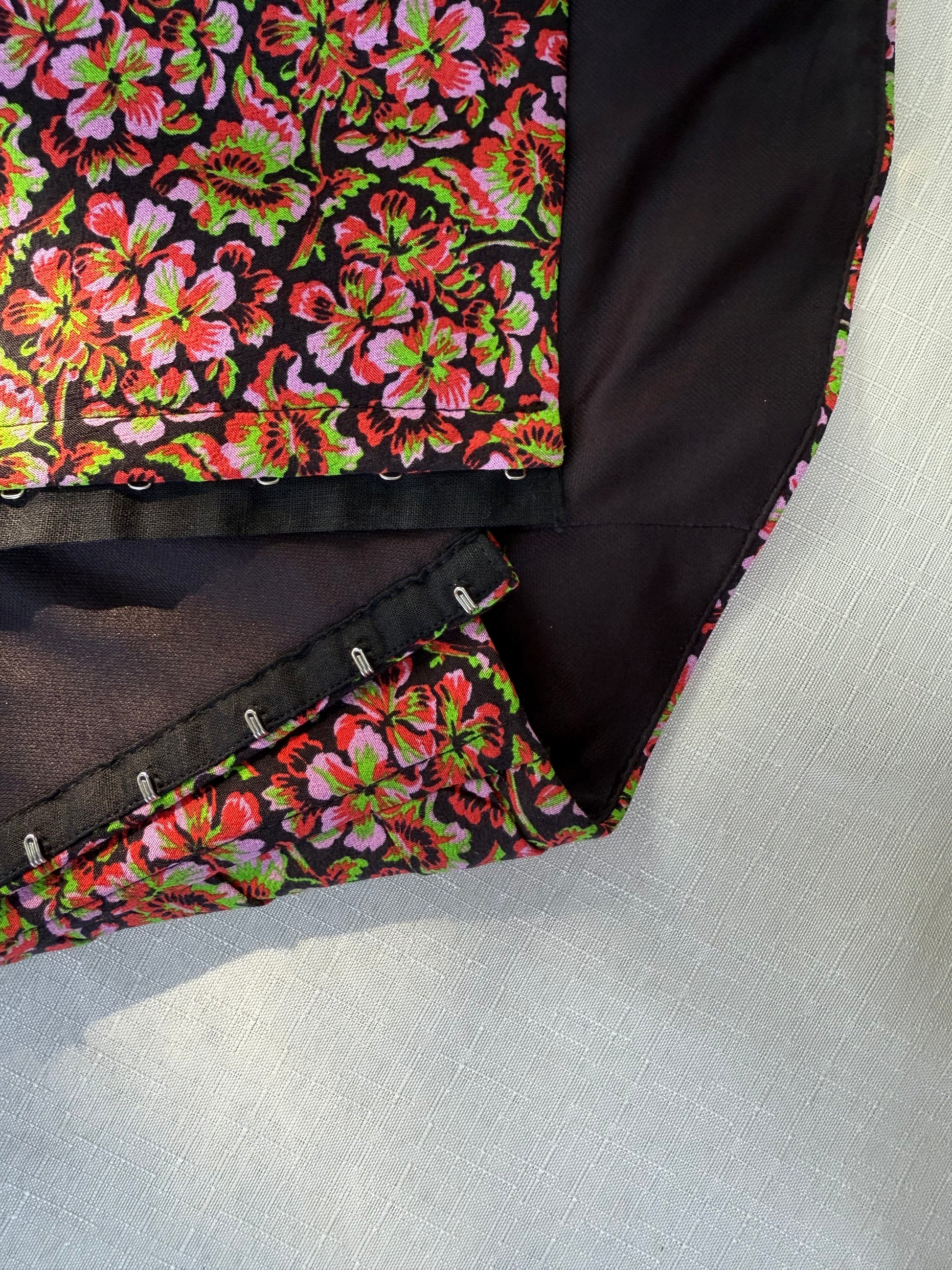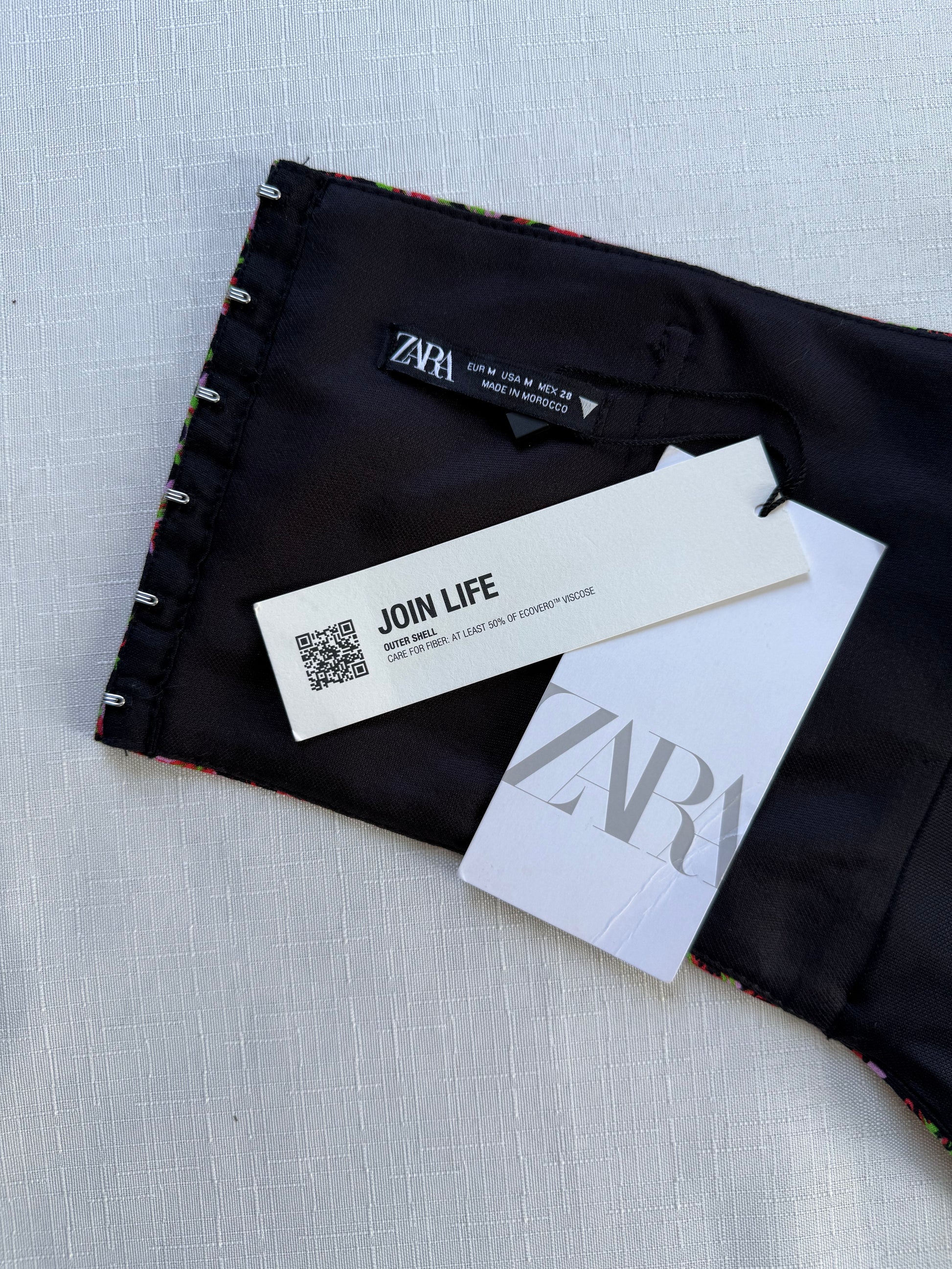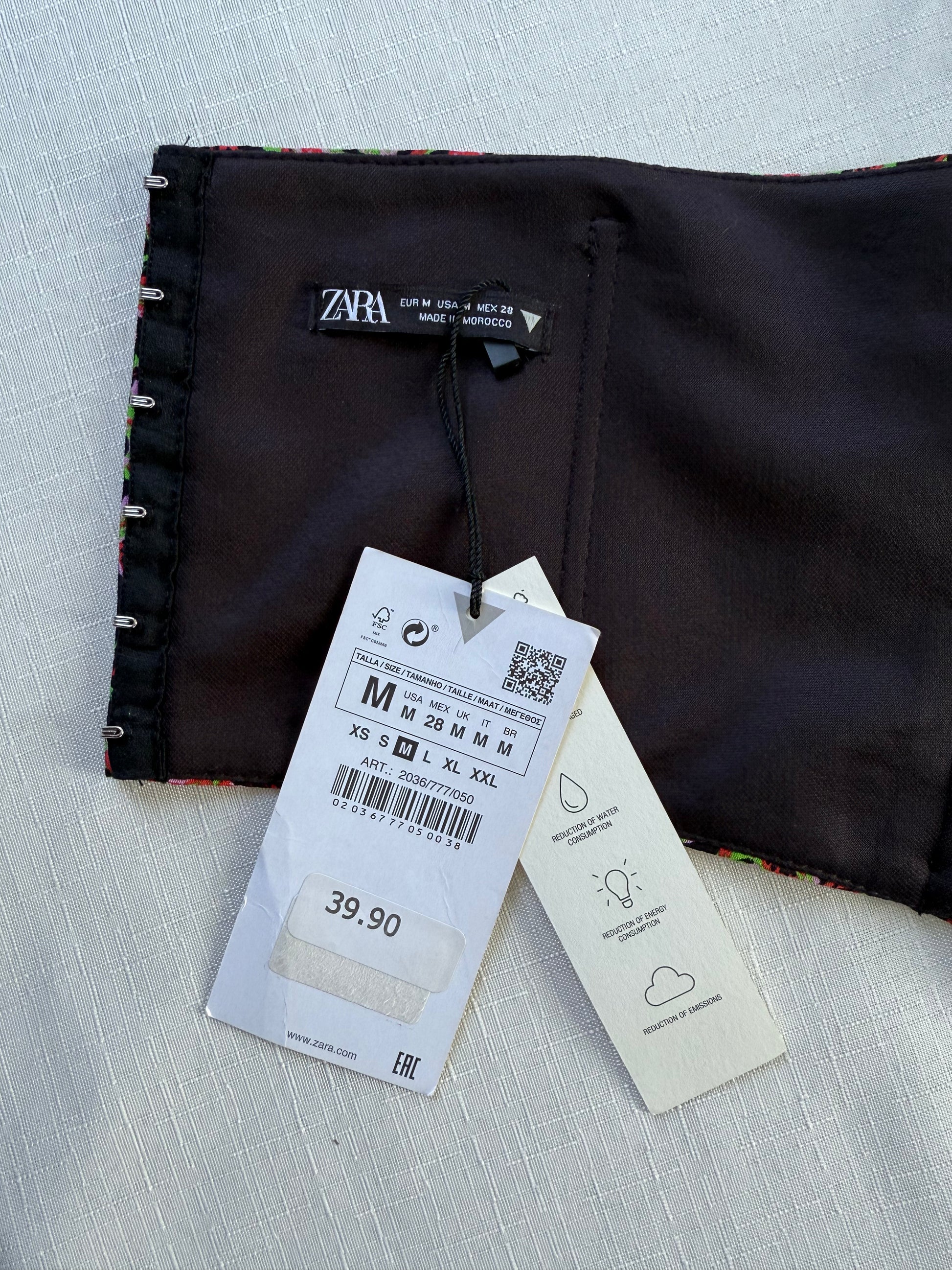 Romantic, sculpted, and slightly chaotic—in the best way. This Zara strapless corset top blends rich floral jacquard with a curved, structured silhouette that means business. Vivid reds, pinks, and greens bloom across a deep black base, giving “garden party but make it nightlife.” Hook-and-eye closures keep it secure, while boning and full lining offer shape and support without sacrificing comfort.