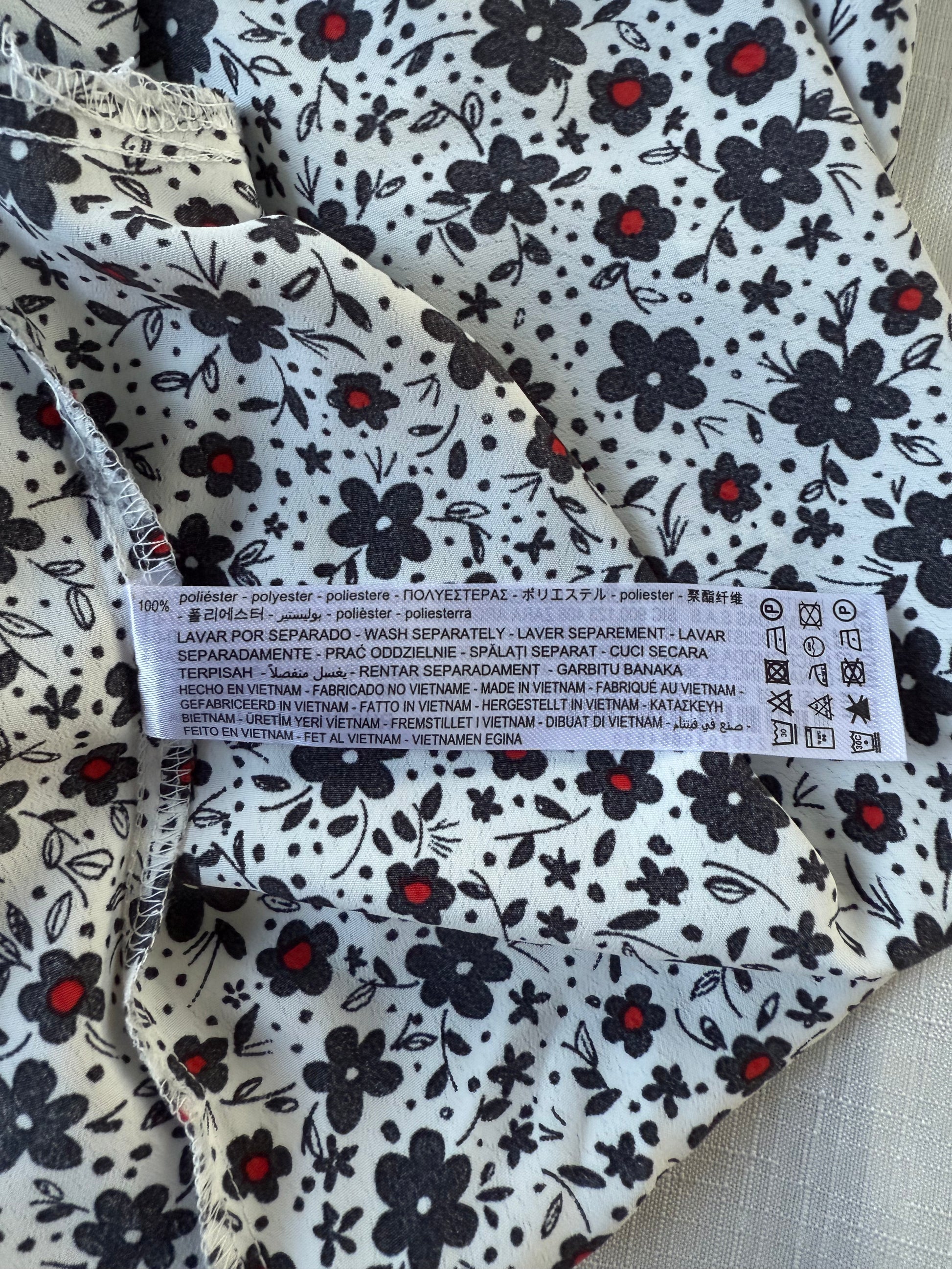 Soft and sculpted in all the right ways. This cropped floral blouse has that easy romantic feel—vintagey without being too sweet. Black and burgundy blooms dot a creamy base, with puffed sleeves, a v-neckline, and a subtle waist tie that lets you cinch it just how you like. The fit is flattering but chill, perfect with high-rise jeans or something flowy.